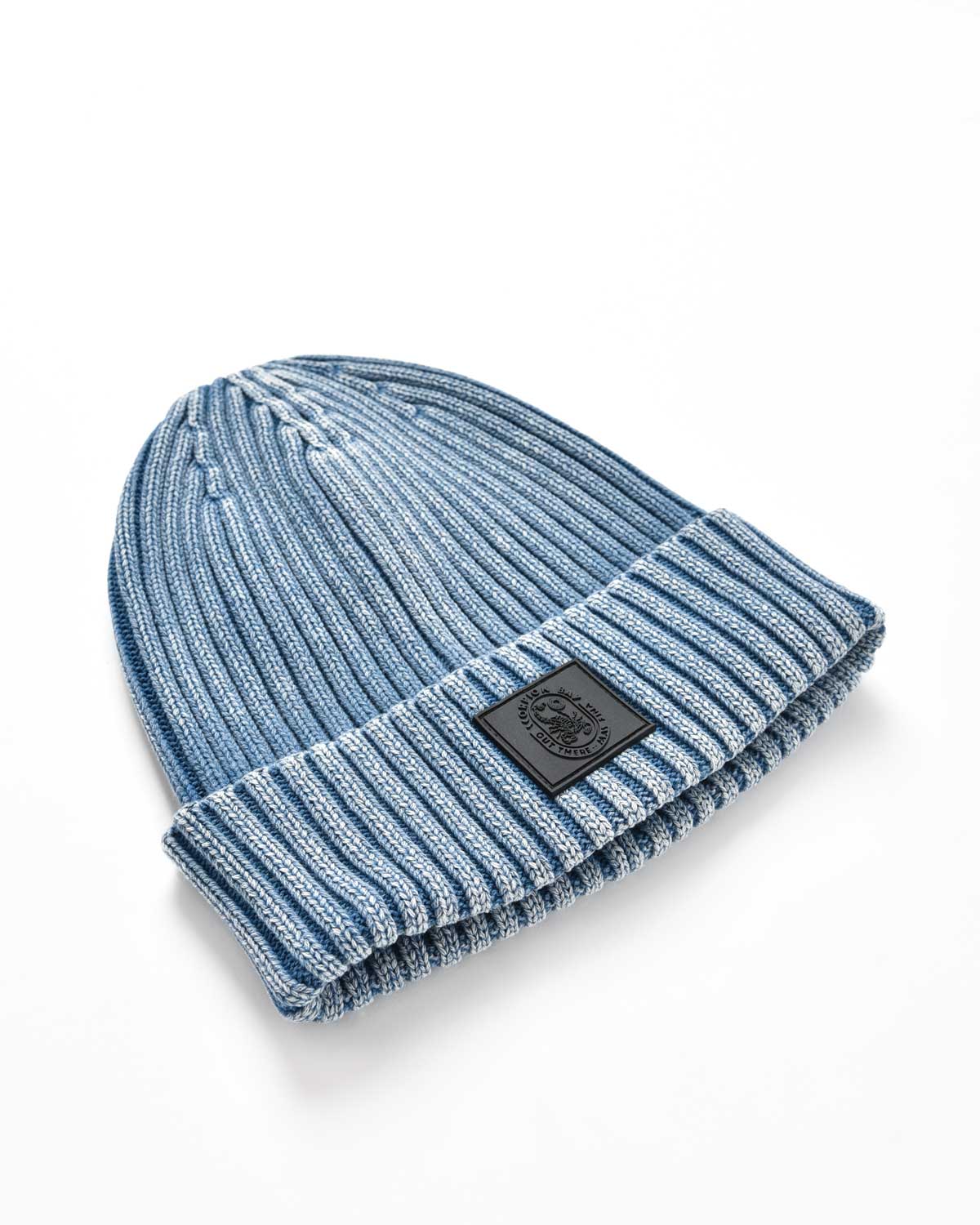 berretto in maglia calata colore petrolio con lavorazione di costa verticale trattato per ottenere un effetto vissuto. ad impreziosire l'accessorio una patch in gomma con logo applicata sul davanti.