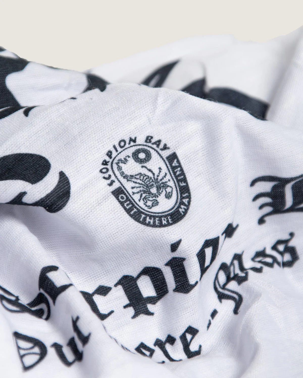 Bandana scaldacollo bianco con stampa scorpione nero. Senza cuciture. Bordo tagliato al vivo. Multifunzione. Traspirante.