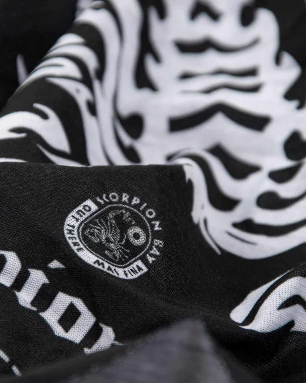 Bandana scaldacollo nero con stampa scorpione bianco. Senza cuciture. Bordo tagliato al vivo. Multifunzione. Traspirante.