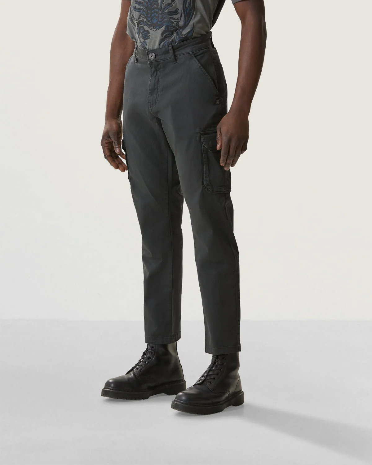 Pantaloni cargo uomo elasticizzato color grigio carbone. Tasche volume laterali con patella. Vita fissa con zip e bottone. Etichetta logo in vita sul retro