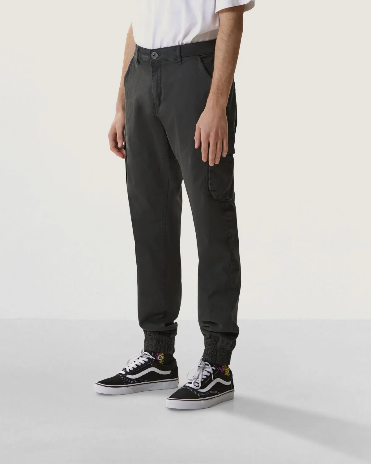 Pantaloni cargo uomo con elastico sul fondo color grigio carbone. Tasche volume laterali con patella. Vita fissa con zip e bottone. Etichetta logo in vita sul retro.