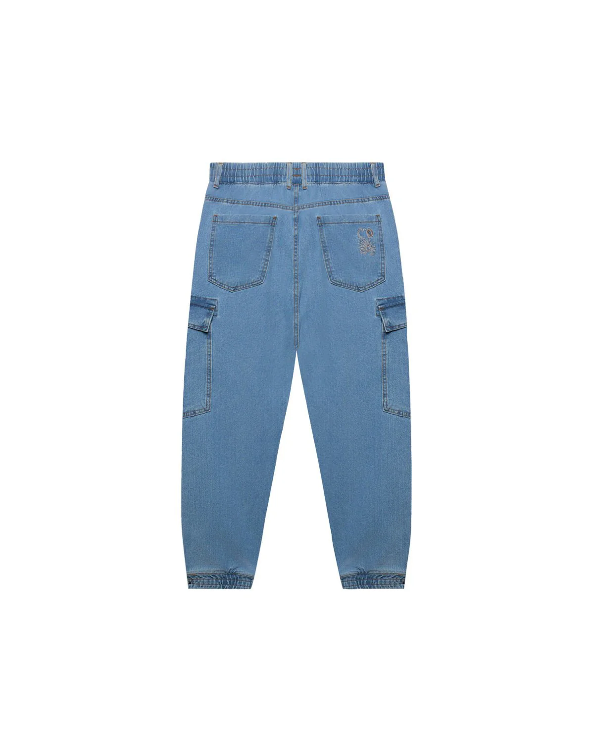 Pantaloni cargo in denim uomo. Vestibilità loose relaxed. Vita elasticata regolabile ed elastico sul fondo.Tasche laterali con pattella. Ricamo scorpione sulla tasca posteriore.